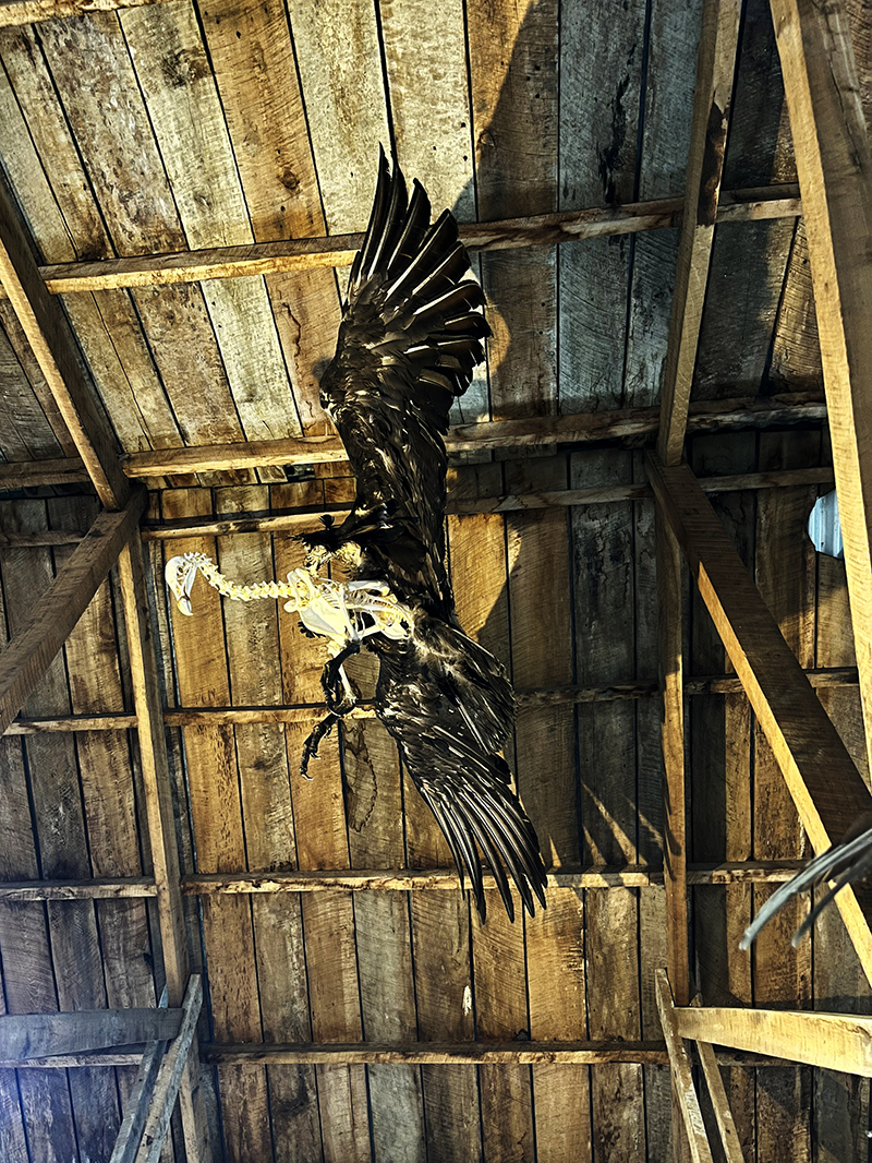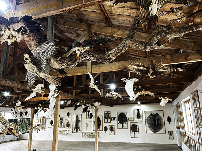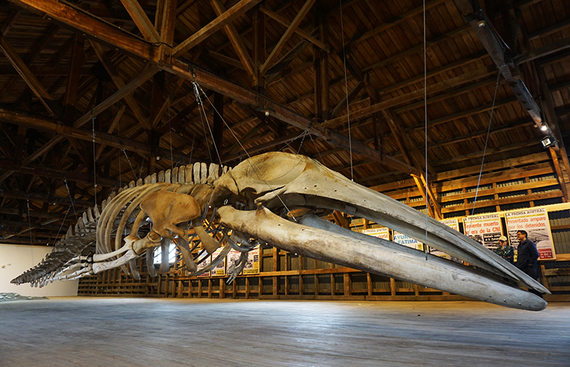 博物馆分别在两个仓库建筑里,一个是各种本地区海洋生物和动物的骨骼陈列,另一个则是各种生物标本的完整形态呈现。陈列馆里种类繁多的动物包括鸟类的骨骼看得我眼花缭乱,而迎接了我们的女子在送我们去另一个仓库后,又回到大长桌前清洁和整理动物骨骼。另一个仓库里安第斯的鹰和极地的海鸟标本在木结构的屋顶下“飞翔”,南露脊鲸垂着长长的鲸须,墙上铺挂着大大小小的伪虎鲸的头,而明星当属正中那具巨型的塞鲸骨架。